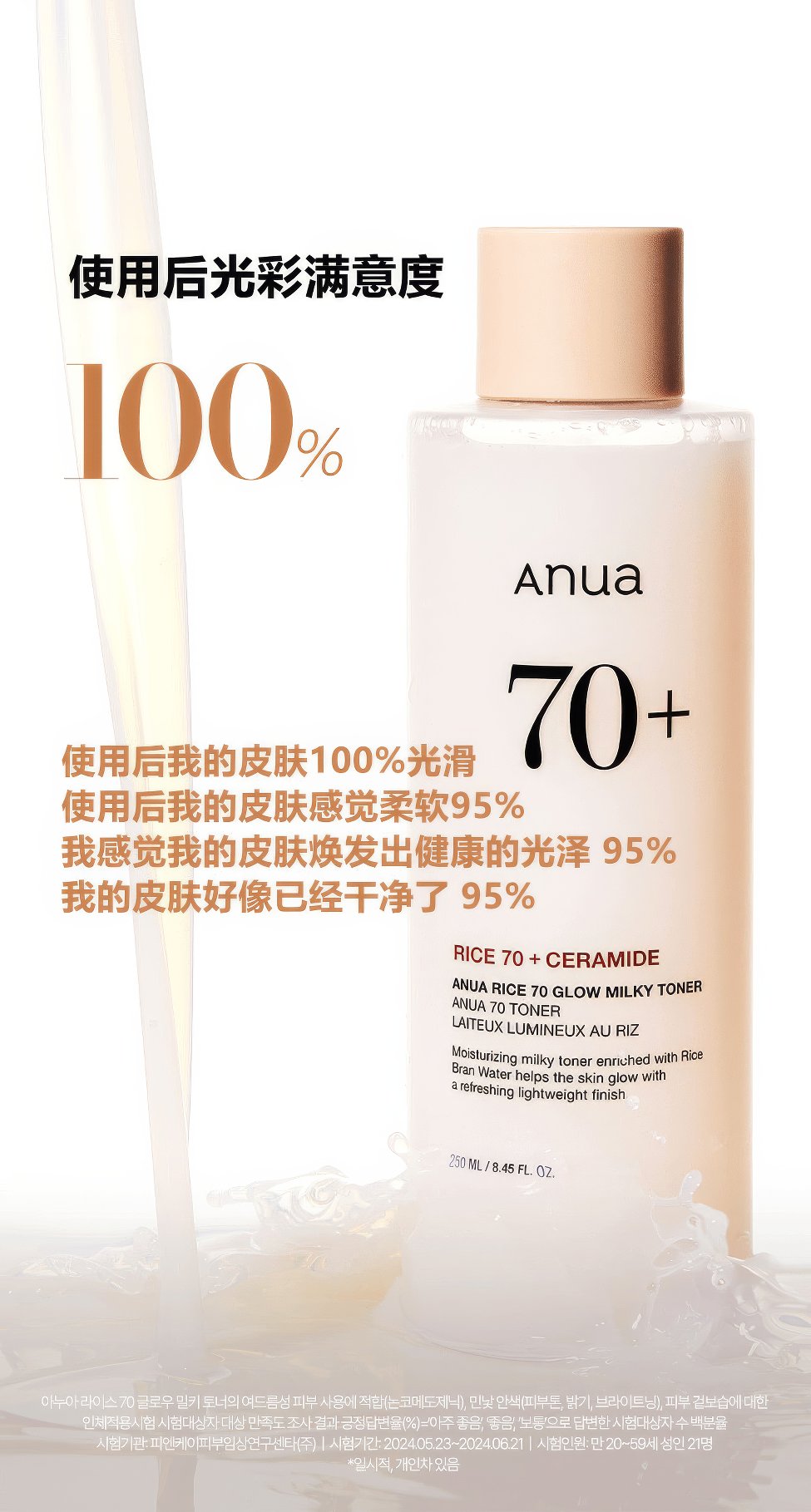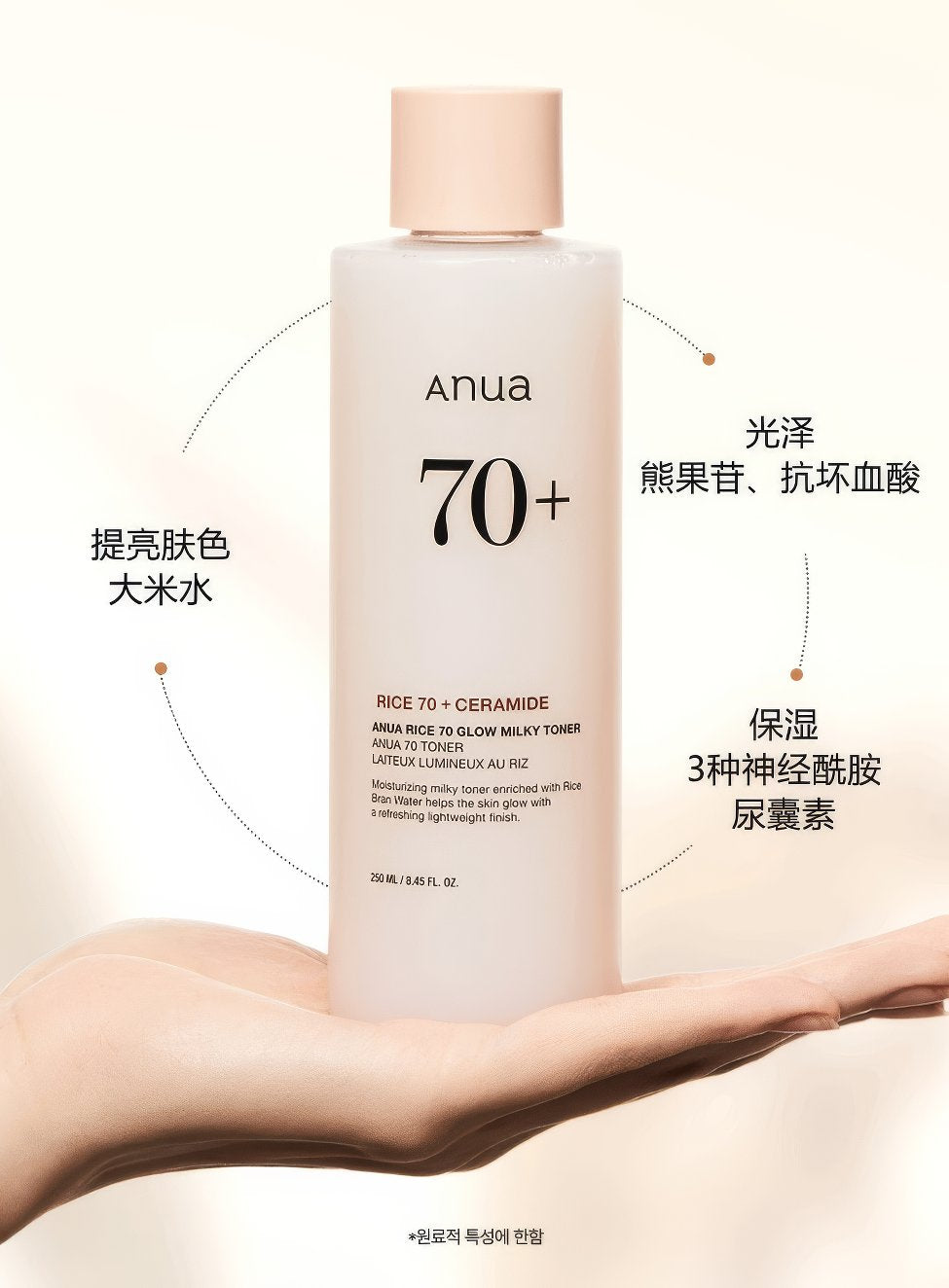Reveal a brighter, deeply hydrated complexion with Anua Rice 70+ Glow Milky Toner, a silky, nutrient-rich formula infused with 70% rice extract. This skin-replenishing powerhouse delivers long-lasting moisture while enhancing radiance and elasticity for a plump, dewy glow.