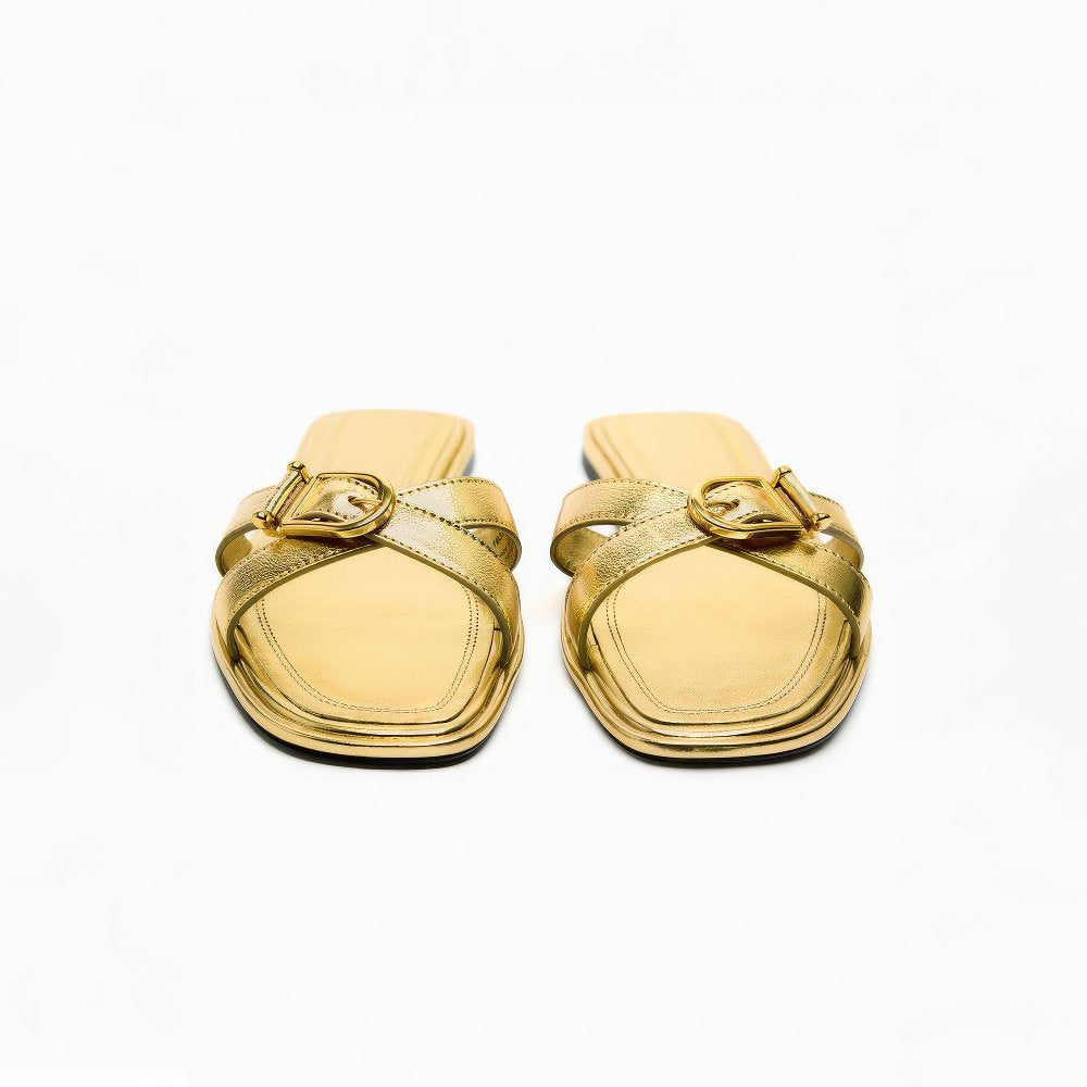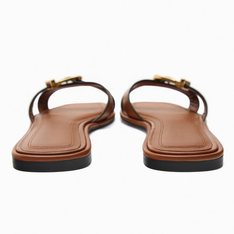 Brown Leather Metal Big Toe Ring Flat Sandals