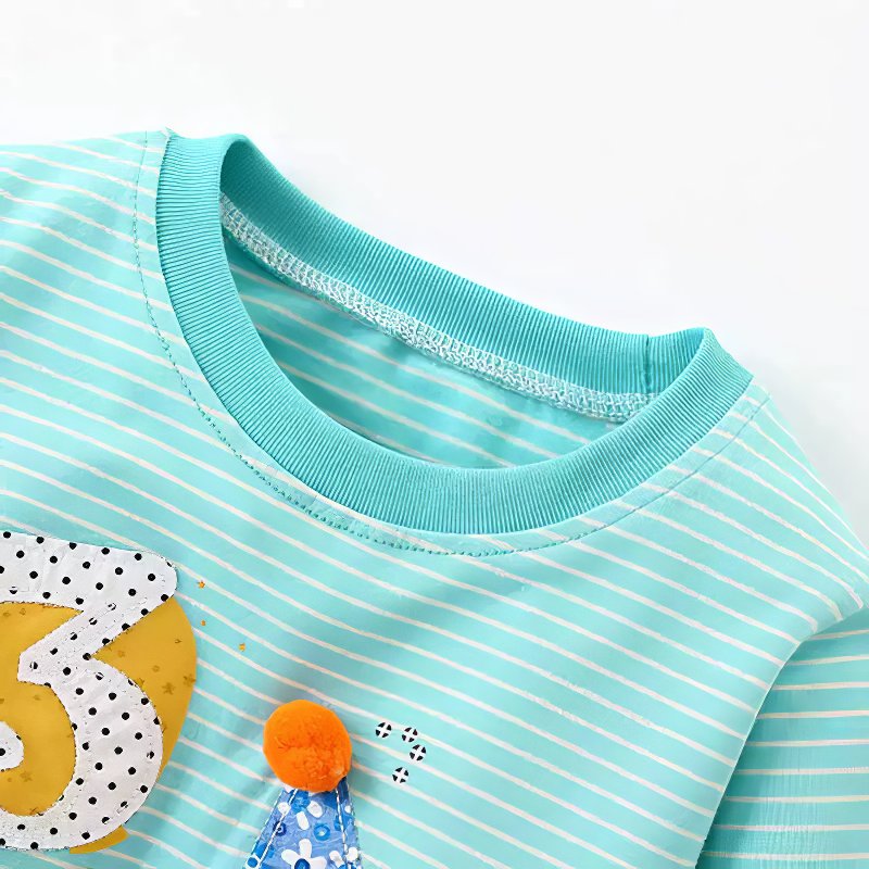 Designed with a classic crew neckline and short sleeves, this tee offers a relaxed fit, allowing your toddler to move freely and enjoy the day's activities. The durable fabric ensures it can withstand the excitement of a birthday party and beyond.