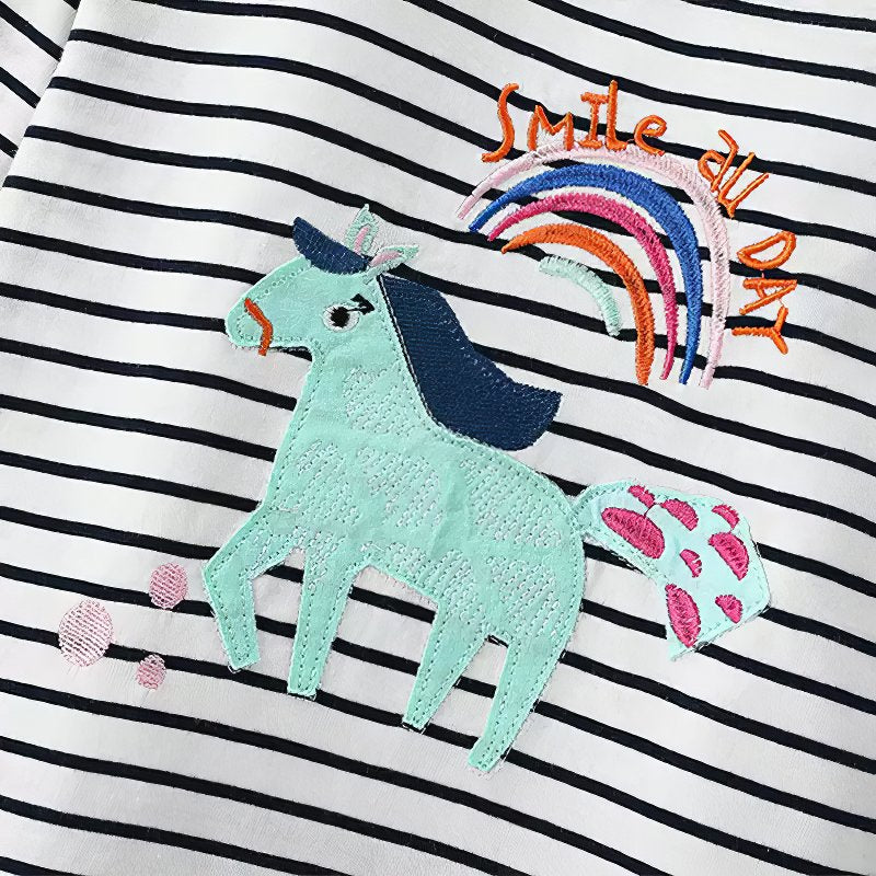 Add a dash of enchantment with the Striped Long-Sleeve T-Shirt with Unicorn and Rainbow Appliqué—a charming piece that pairs perfectly with leggings, tutus, or jeans. It’s a must-have for unicorn fans who love comfort and style in one colorful package.