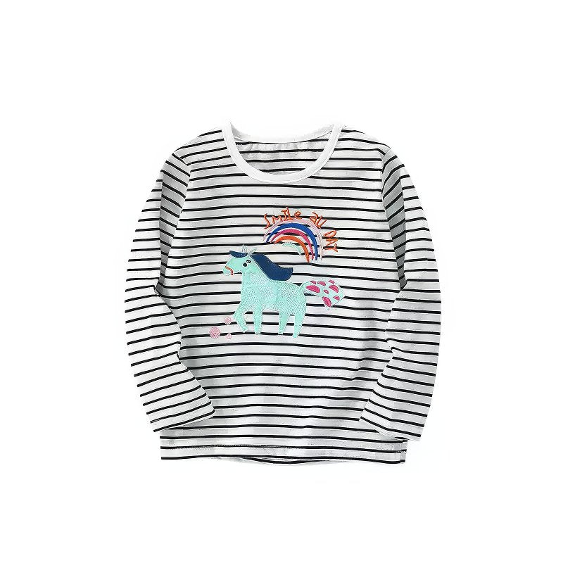 Striped Long-Sleeve T-Shirt with Unicorn and Rainbow Applique