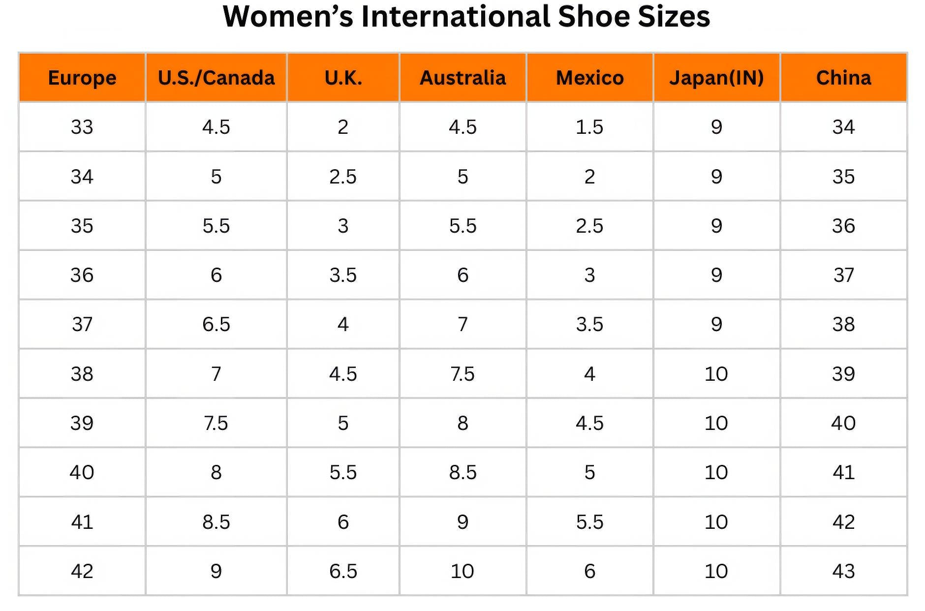Shoe Size | USA / Canada | Standard EU | Australia / UK | Korea | Japan |