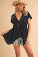 La blusa de manga corta con cuello en V y detalle de fruncido presenta un favorecedor escote en V con elegantes fruncidos. Esta blusa de manga corta ofrece un look cómodo y chic. El detalle de fruncido le da un toque de elegancia al clásico escote en V. Combínala con pantalones o falda para un look versátil y sofisticado.