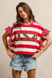 This stylish striped blouse features eye-catching red and white horizontal stripes with a fashion leopard print graphic accent. Made from comfortable cotton blend fabric, it offers a relaxed fit perfect for casual wear. The distinctive ruffle sleeves add a feminine touch while the bold stripe pattern creates a modern, playful look. The round neckline and short sleeves make it versatile for layering or wearing alone. Perfect for everyday casual outings, weekend activities, or creating effortless street style looks.