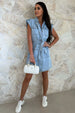 This fashion utility-style denim mini dress combines fashion with functionality. Made from high-quality light beige denim, it features multiple practical pockets, a flattering waist tie belt, and a classic collared neckline. The sleeveless design and mini length make it perfect for warm weather. The dress can be styled with sneakers for a casual look or dressed up with heels. The durable denim material ensures longevity while maintaining comfort for all-day wear. Ideal for various occasions from shopping to casual outings.