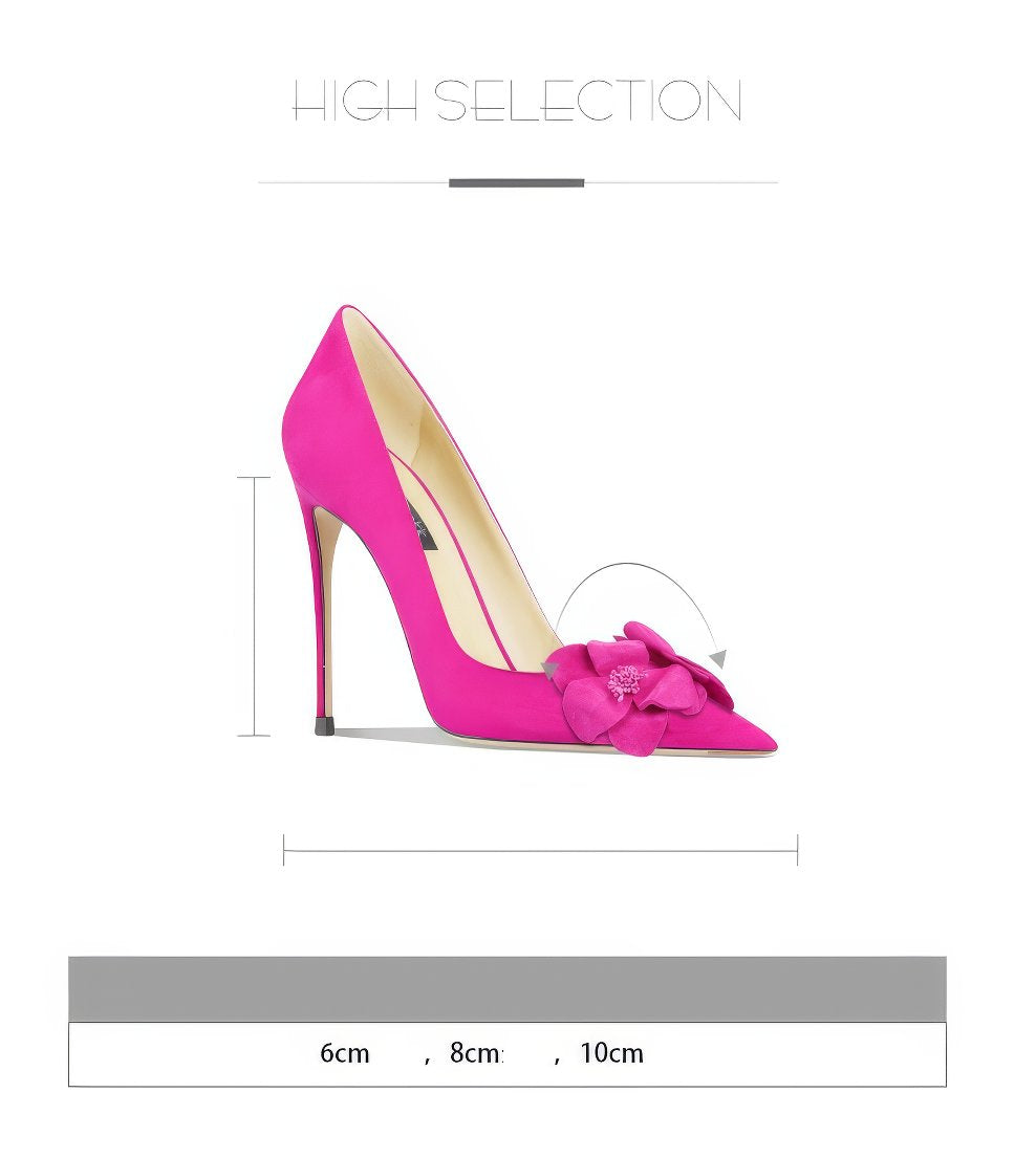 Realza tu elegancia con nuestros zapatos de tacón de satén con punta puntiaguda y adornos florales, donde la sofisticación se fusiona con la fantasía. Estos exquisitos zapatos presentan un lujoso acabado satinado que brilla a cada paso, complementado con intrincados adornos florales que añaden un toque de romanticismo y refinamiento. El diseño de punta puntiaguda crea una silueta elegante y moderna, alargando las piernas y realzando tu look.