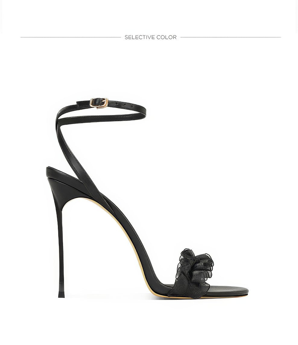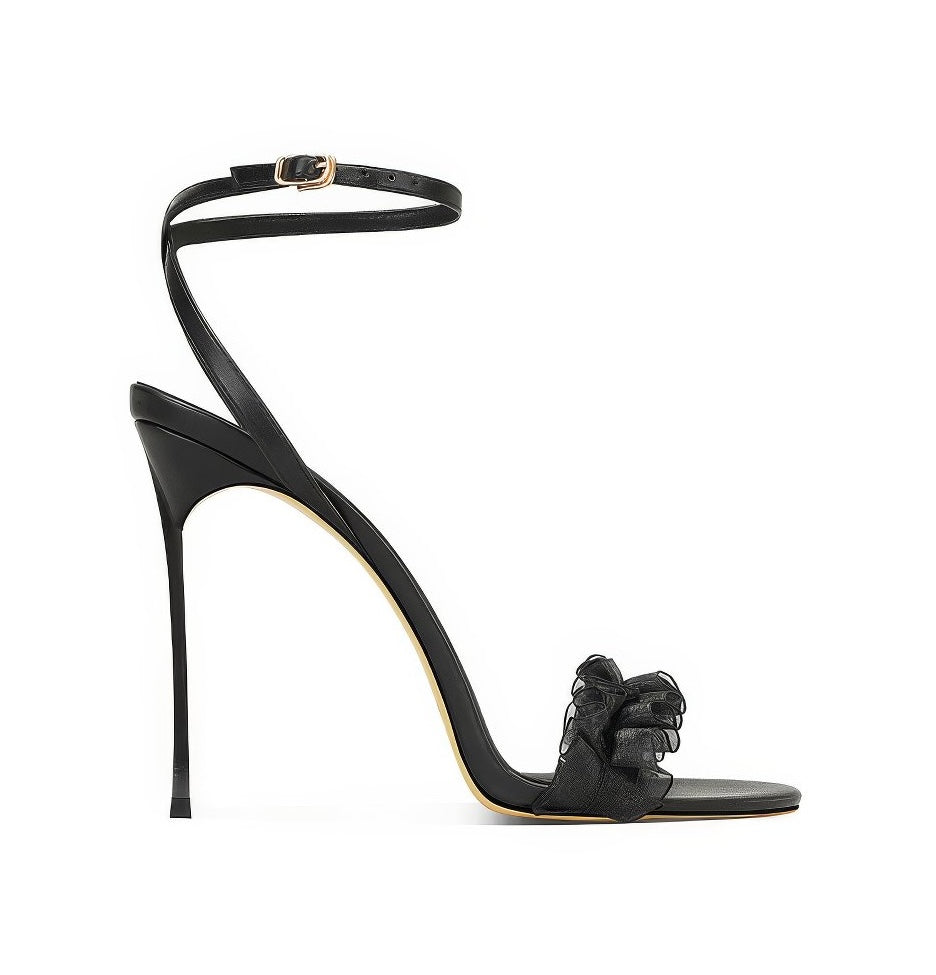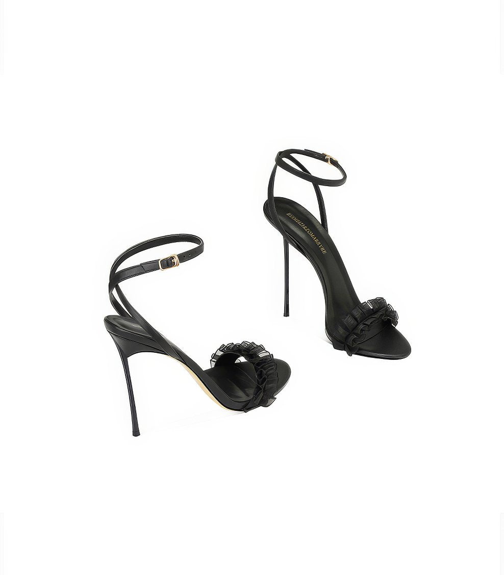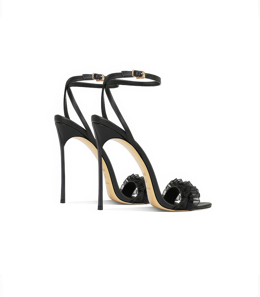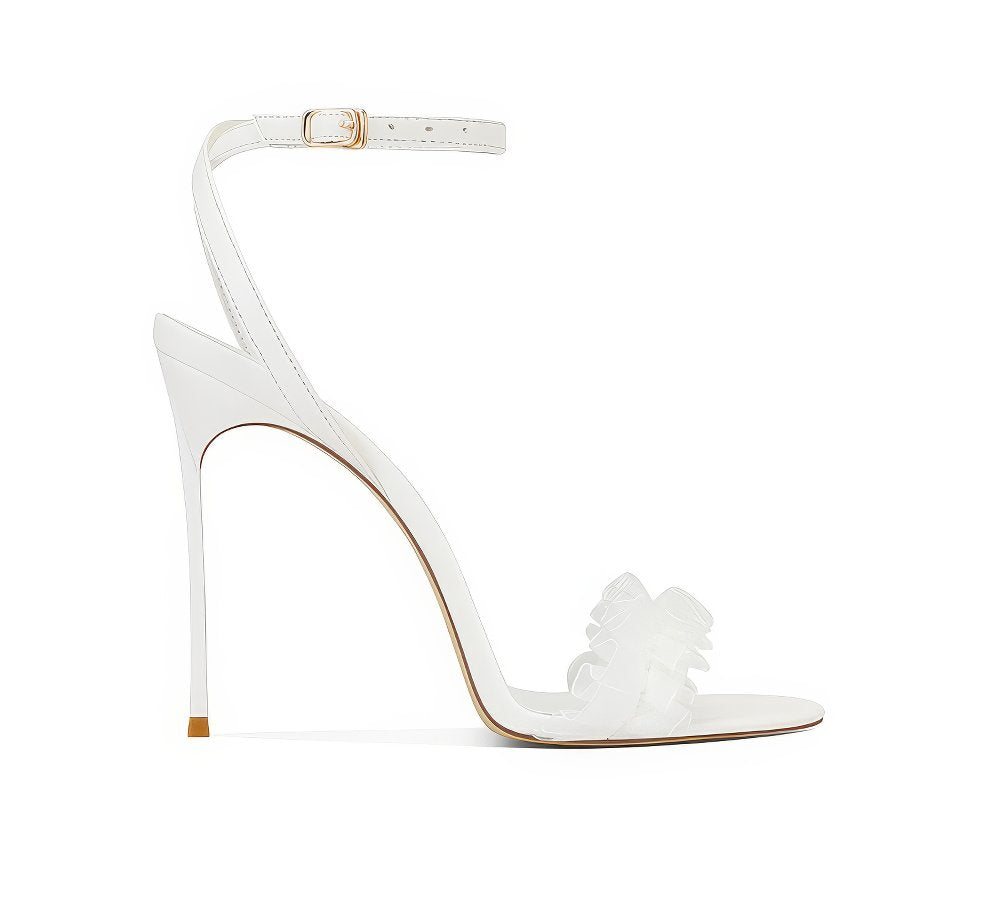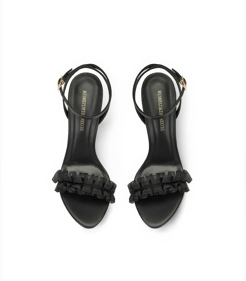 Dale un toque de estilo a tus looks con nuestros tacones con volantes y tiras en el tobillo con punta abierta, donde el diseño divertido se combina con una elegancia sin esfuerzo.