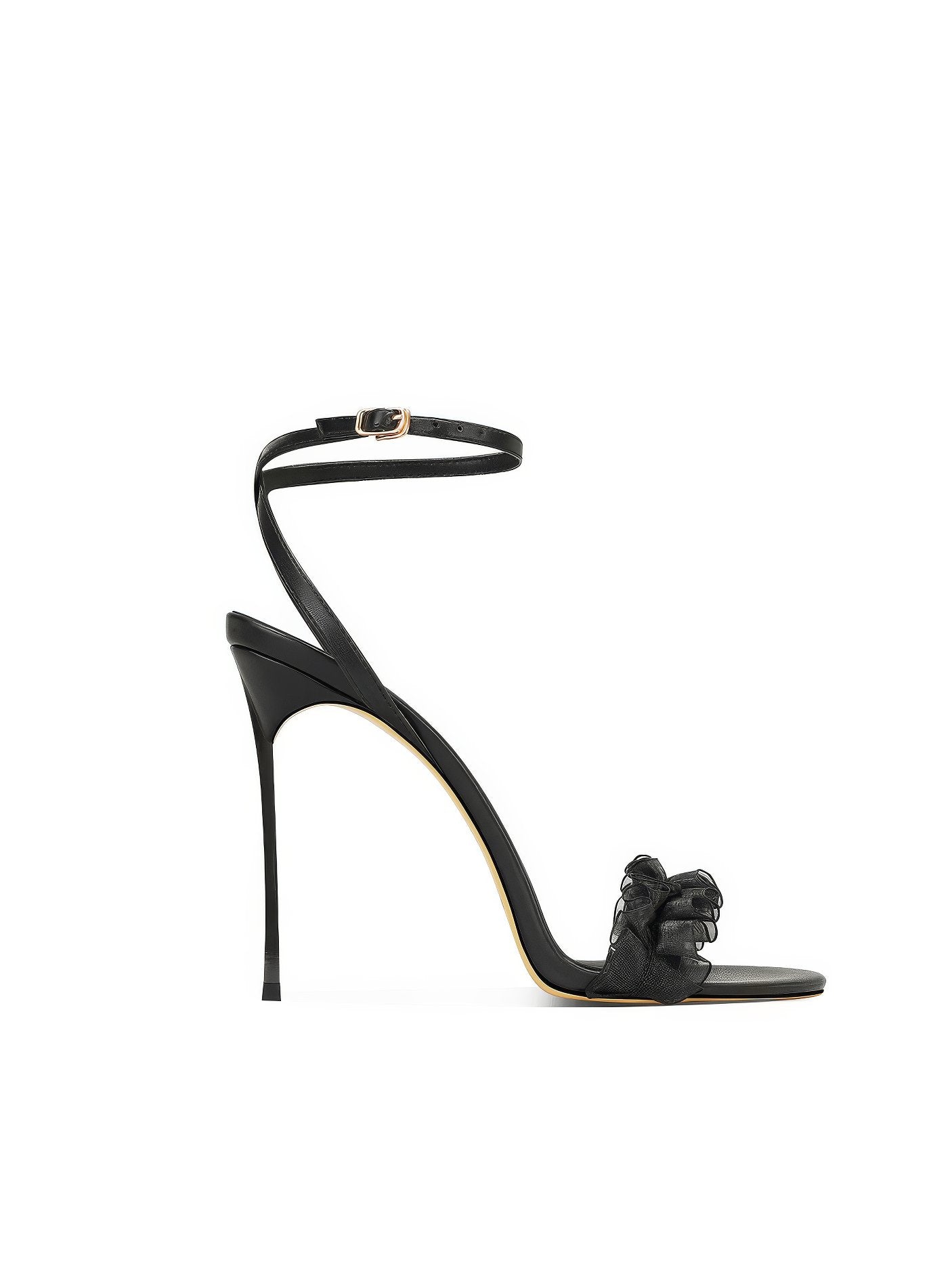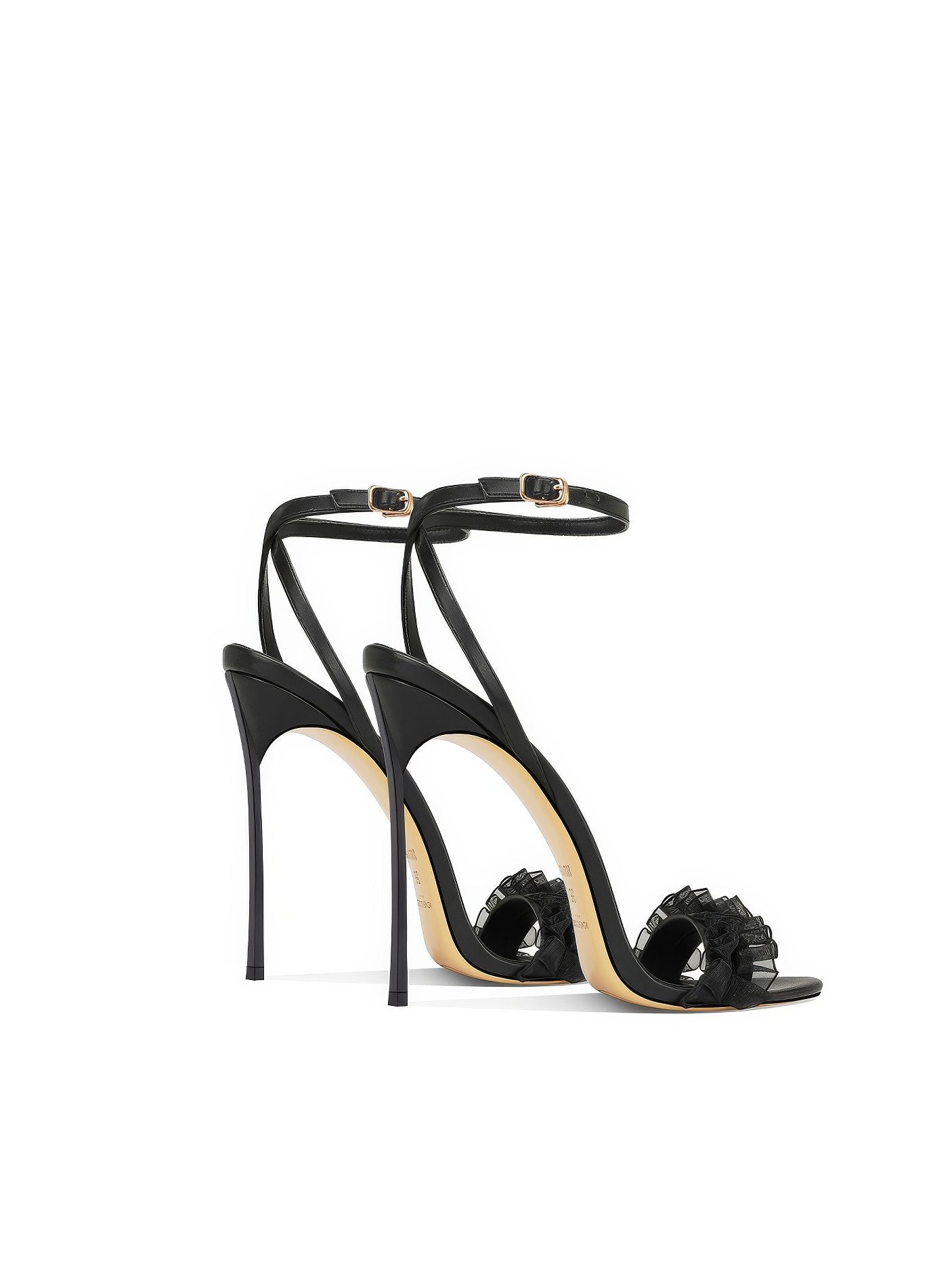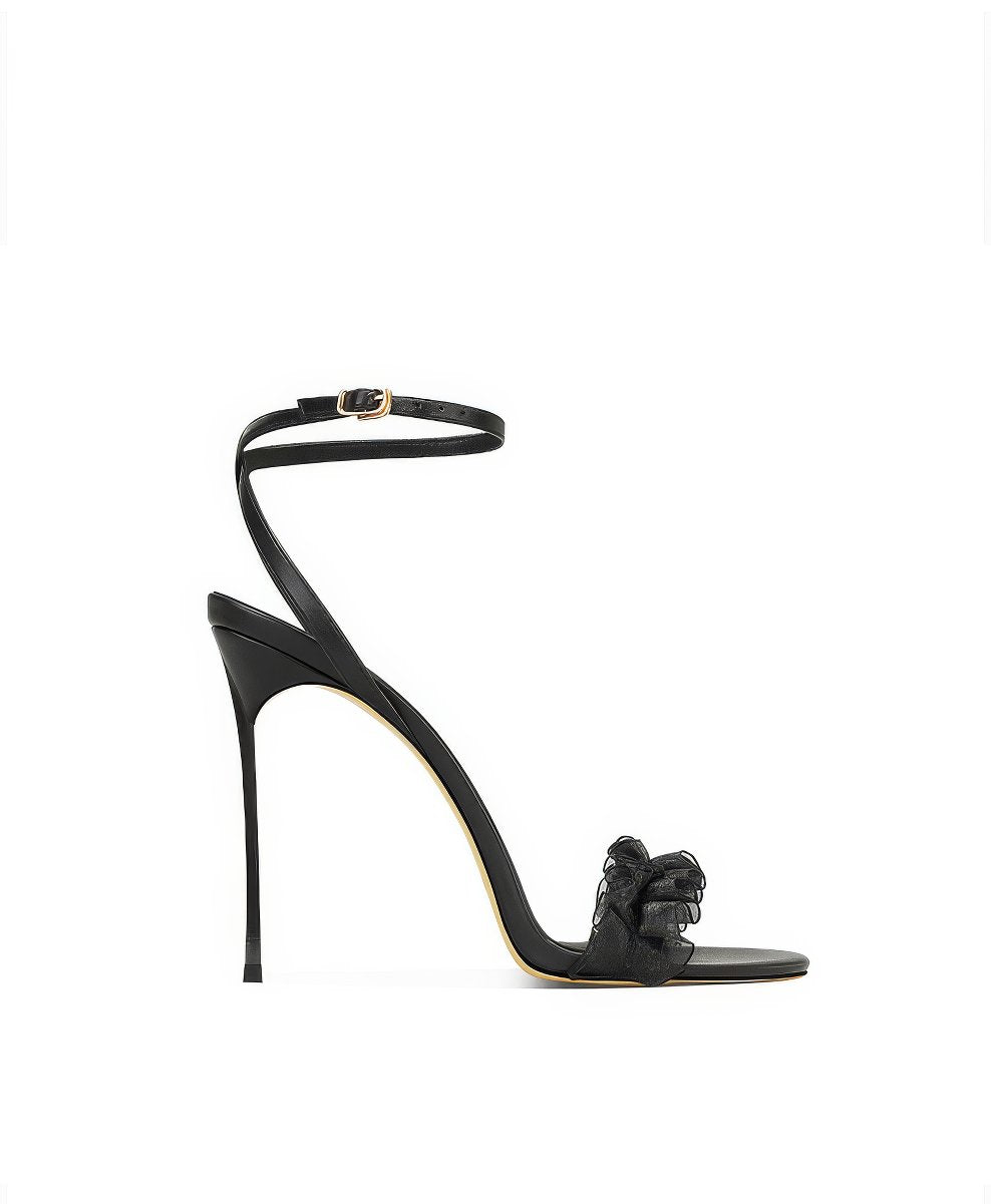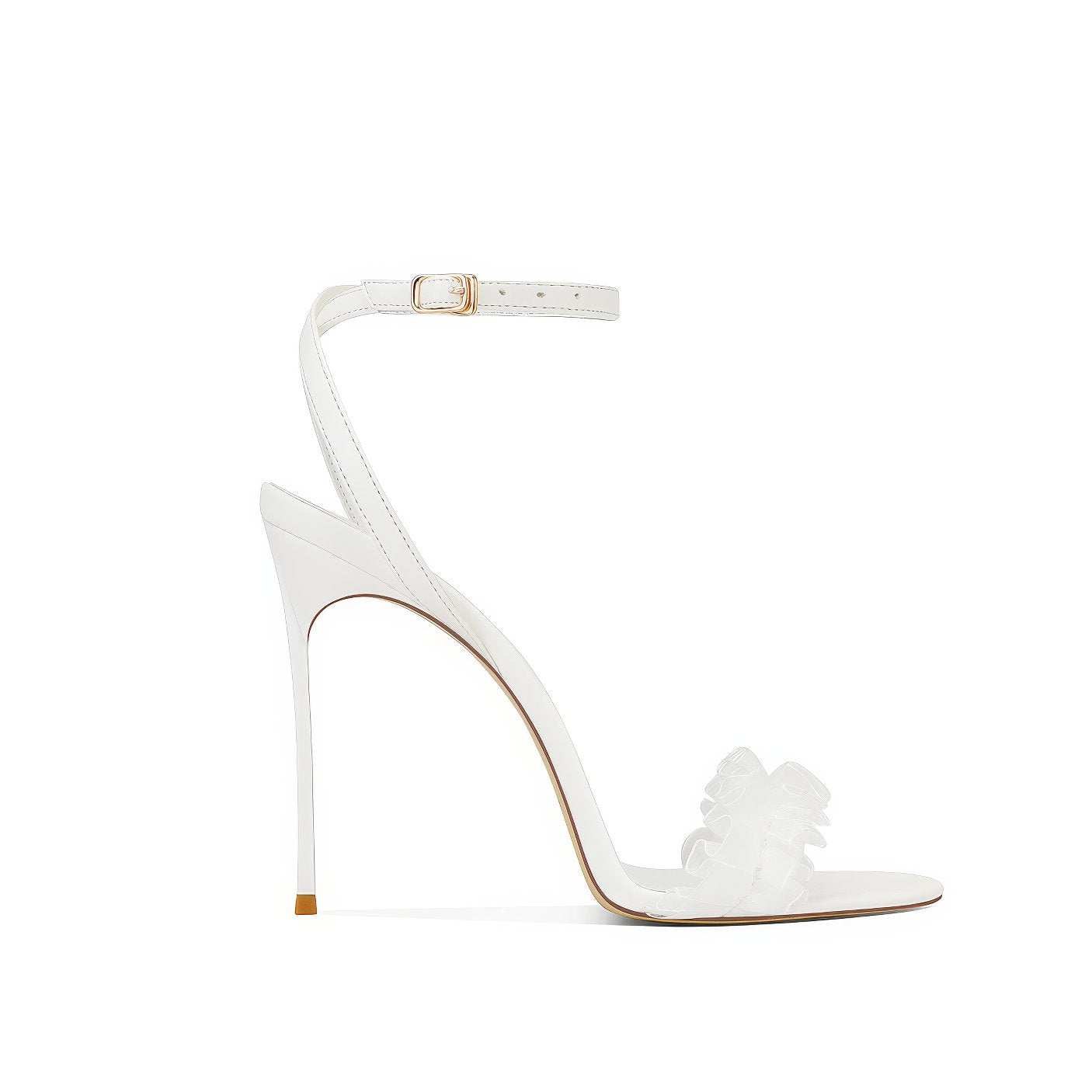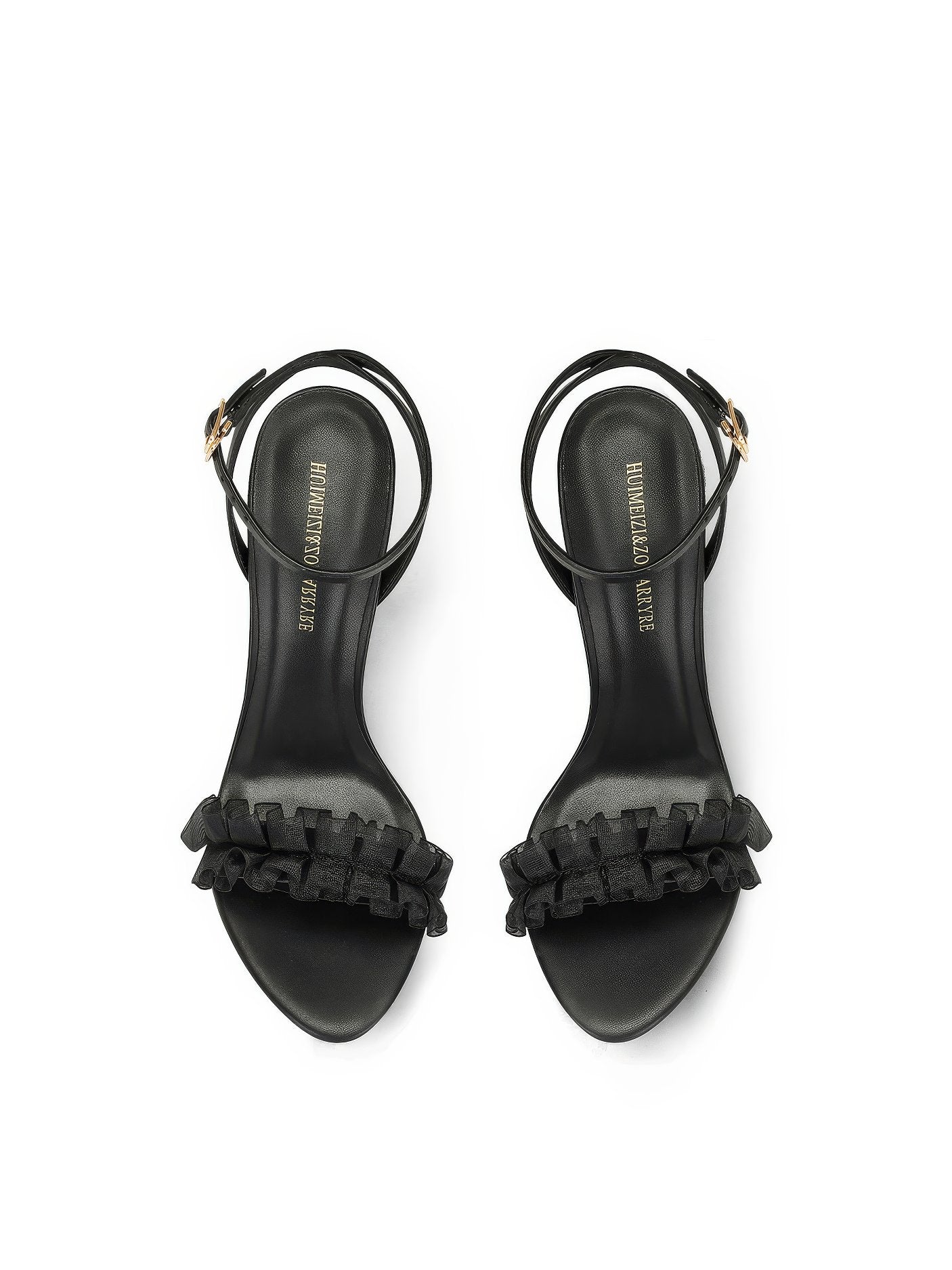 Dale un toque de estilo a tus looks con nuestros tacones con volantes y tiras en el tobillo con punta abierta, donde el diseño divertido se combina con una elegancia sin esfuerzo.