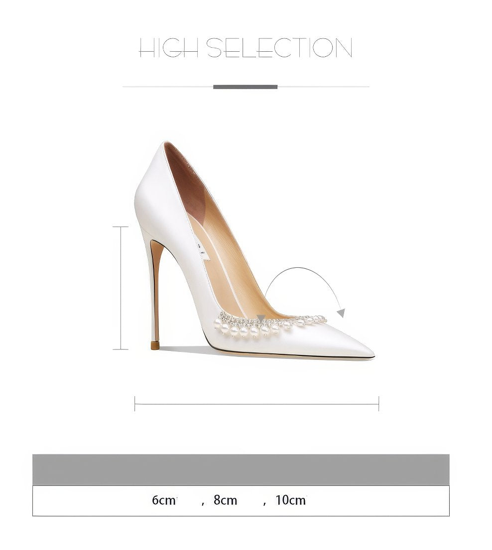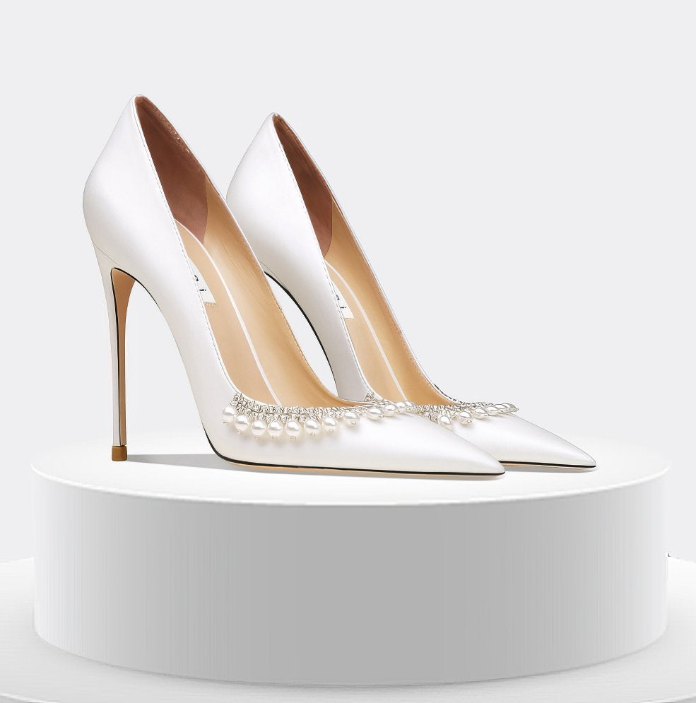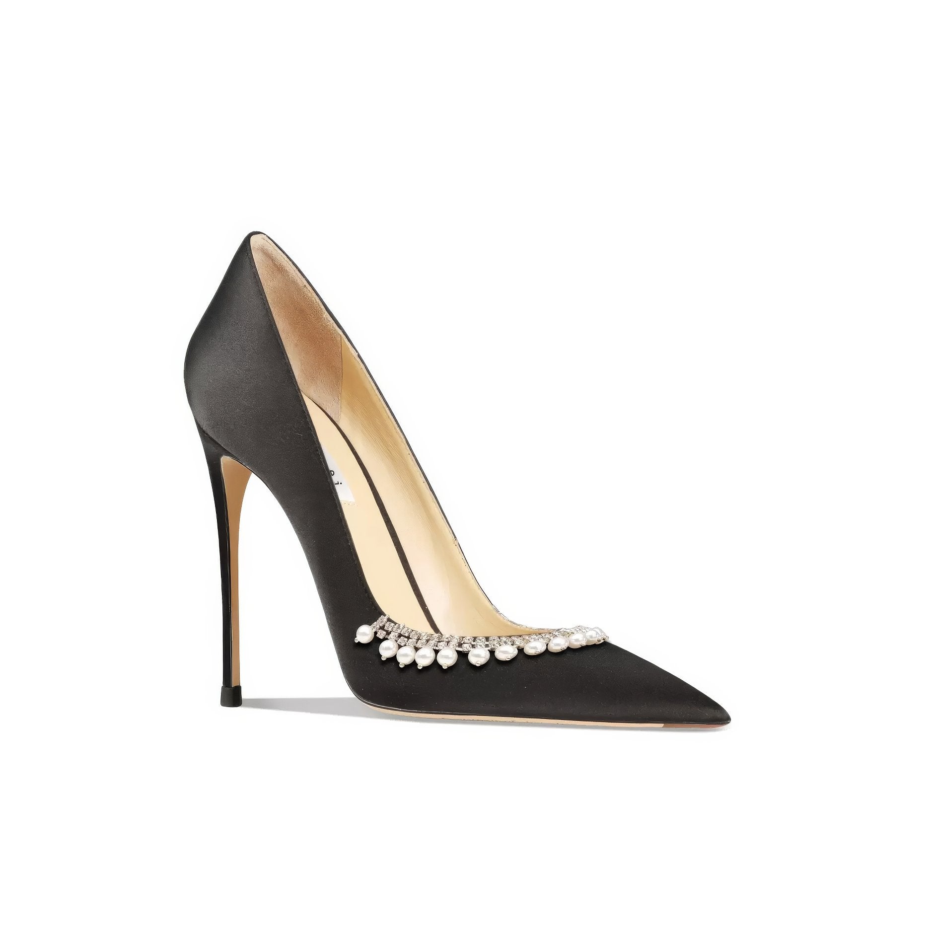 El diseño de punta alarga la pierna y añade un toque moderno a la silueta clásica, mientras que las perlas aportan un toque de glamour y refinamiento. Elaborados con atención al detalle, estos tacones ofrecen estilo y comodidad, ideales para eventos donde quieras brillar. El satén realza la sensación de lujo, y los flecos de perlas capturan la luz con belleza, aportando movimiento y elegancia a cada paso.