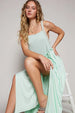 This stunning POL Frill Slit Square Neck Cami Dress features a gorgeous mint green hue that embodies fresh summer vibes. The square neckline creates a modern and flattering frame while adjustable cami straps ensure the perfect fit. The dress showcases a dramatic side slit that adds movement and allure, complemented by subtle frill detailing for a romantic touch. Crafted from lightweight, breathable fabric, this maxi dress offers comfort and style in equal measure. The flowing A-line silhouette flatters various body types while the versatile design transitions seamlessly from casual daywear to evening occasions. The soft, easy-care material ensures low maintenance while maintaining its beautiful drape and color vibrancy.