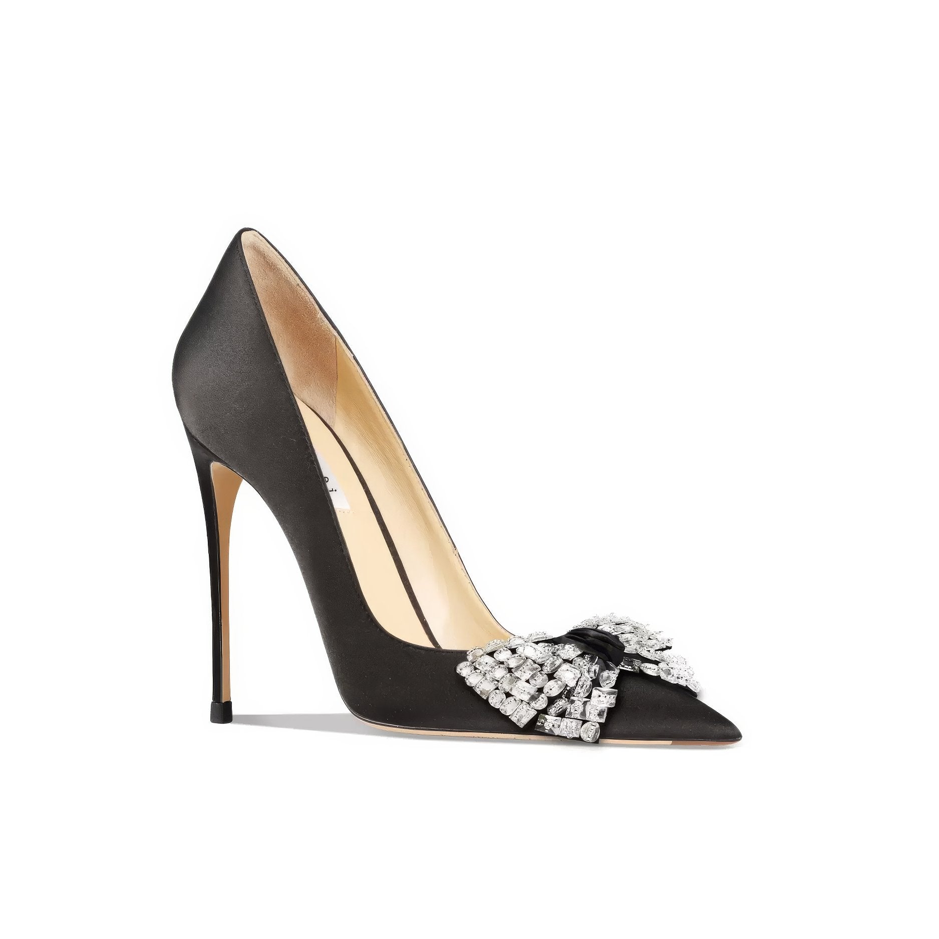 Combínalos con un clásico vestido negro corto para un look atemporal y glamuroso, o con un mono moderno para un toque de estilo. Ya sea para una boda, una gala o una salida nocturna, nuestros tacones de satén con lazo y pedrería te convertirán en el centro de atención. Luce la combinación perfecta de lujo y encanto con estos llamativos tacones.