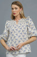 This sophisticated blouse features an all-over bow print pattern in navy blue on a cream background, crafted from lightweight polyester fabric for comfort and durability. The standout ruffle collar adds feminine charm while the three-quarter sleeves with gathered cuffs provide elegant coverage. Perfect for both office wear and casual occasions, this versatile piece offers a relaxed fit that flatters various body types. The button-up front closure ensures easy wear, while the quality construction and fashion pattern make it a wardrobe essential for the modern woman seeking style and comfort.