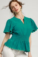 This stunning emerald green blouse features a sophisticated V-neck design with charming flutter sleeves adorned with delicate scalloped edges. The smocked elastic waistband creates a flattering peplum silhouette that accentuates the waist while providing comfortable fit. Crafted from lightweight, flowing fabric, this blouse offers both style and comfort. The vibrant emerald green color makes it perfect for both casual and semi-formal occasions. The decorative contrast stitching along the scalloped edges adds an elegant finishing touch. This versatile piece can be dressed up with tailored pants or dressed down with casual bottoms.