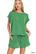 The raised rib cap sleeve top and shorts set offers a stylish and coordinated look for warm weather. The raised rib detailing adds texture and interest to the outfit. The cap sleeves provide a flattering and breezy silhouette for the top. Perfect for lounging or casual outings, this set combines comfort and fashion effortlessly. Stay chic and comfortable with this trendy matching set.