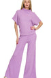 This stunning lavender knit sweater set features a sophisticated two-piece design perfect for modern fashion enthusiasts. The set includes a high-neck short-sleeve sweater with a relaxed, oversized fit paired with matching wide-leg palazzo pants. Crafted from premium soft knit material that offers both comfort and style, this coordinated outfit showcases a beautiful lavender purple hue that's both fashion and timeless. The sweater features a contemporary high neckline and roomy silhouette, while the wide-leg pants include a comfortable elastic waistband for all-day wearability. This versatile set transitions effortlessly from casual daywear to elevated evening looks, making it a must-have addition to any fashion-forward wardrobe. The monochromatic styling creates a cohesive, polished appearance that's perfect for various occasions.