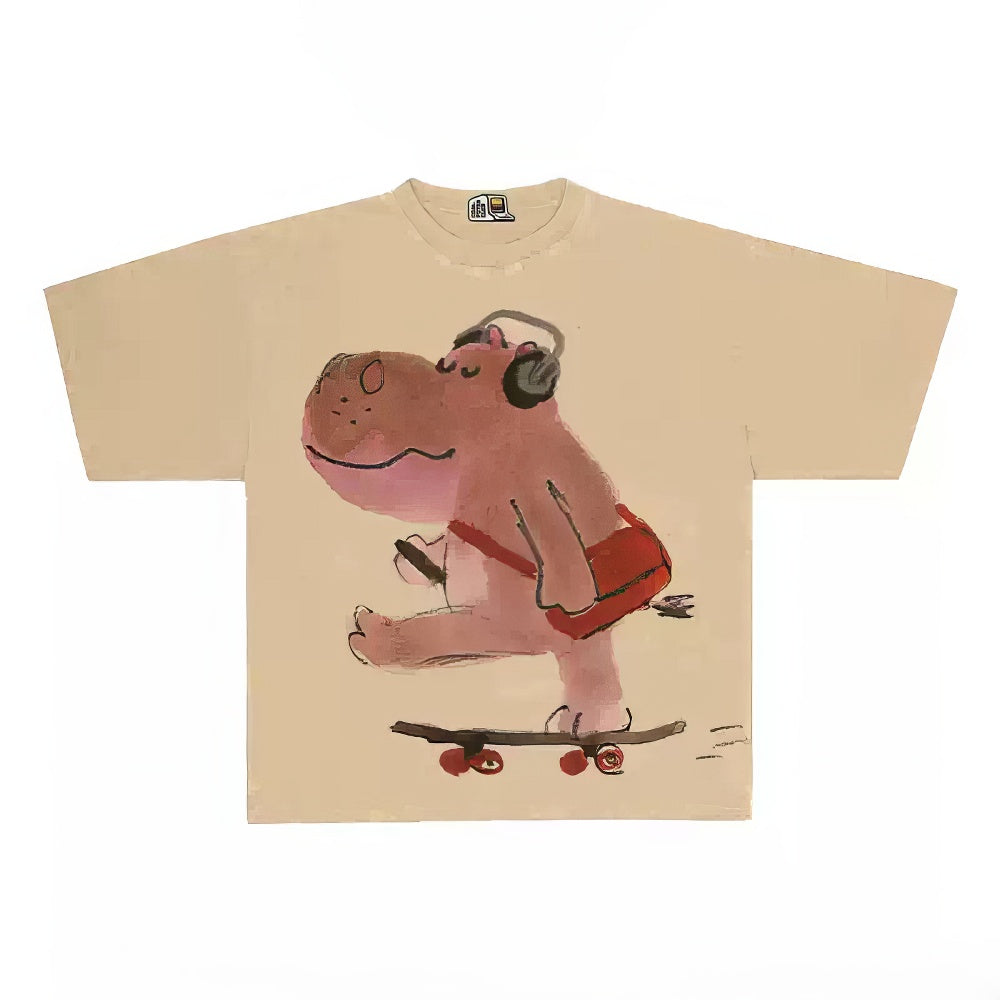 Hipster Hippo Graphic Tee with Skateboard and Headphones Print
