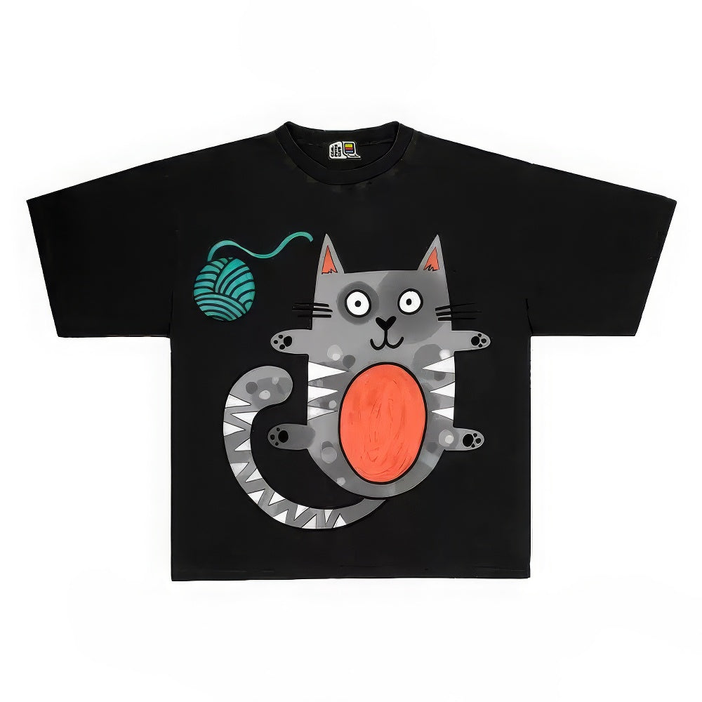 Humorous Graphic Tee with Playful Cat and Yarn