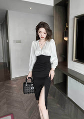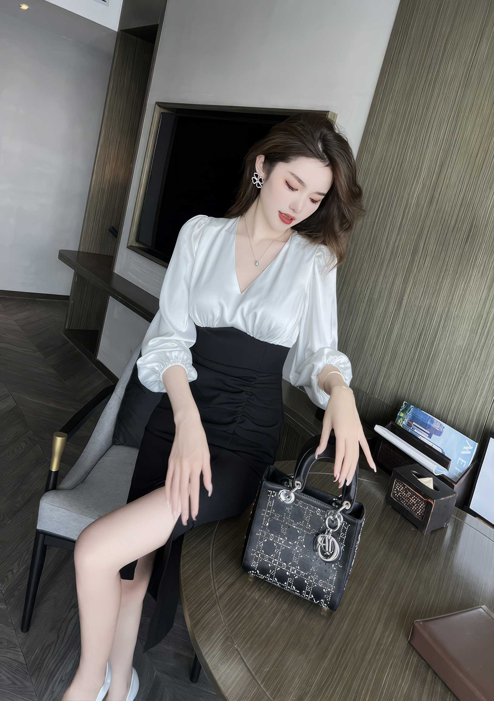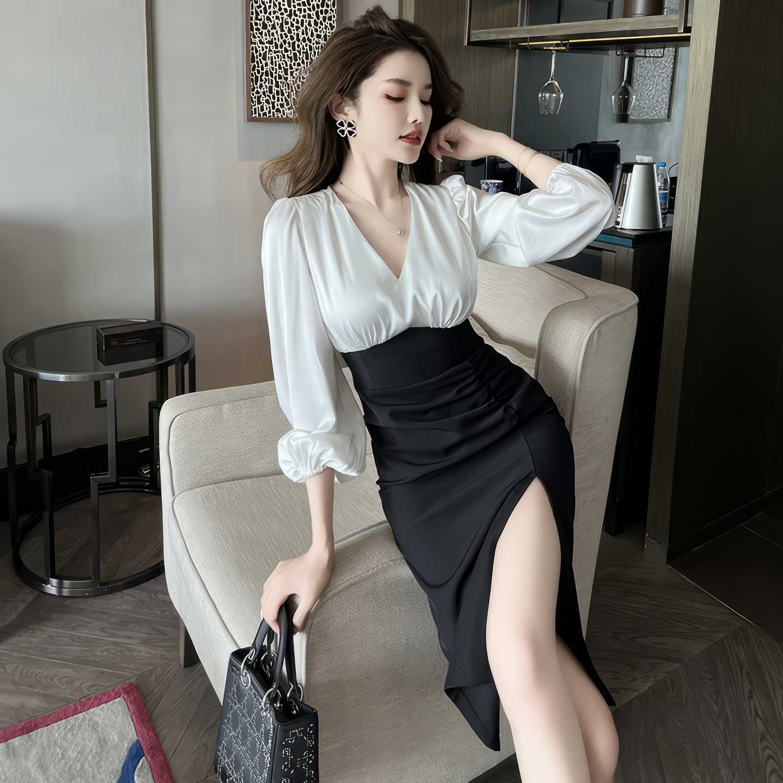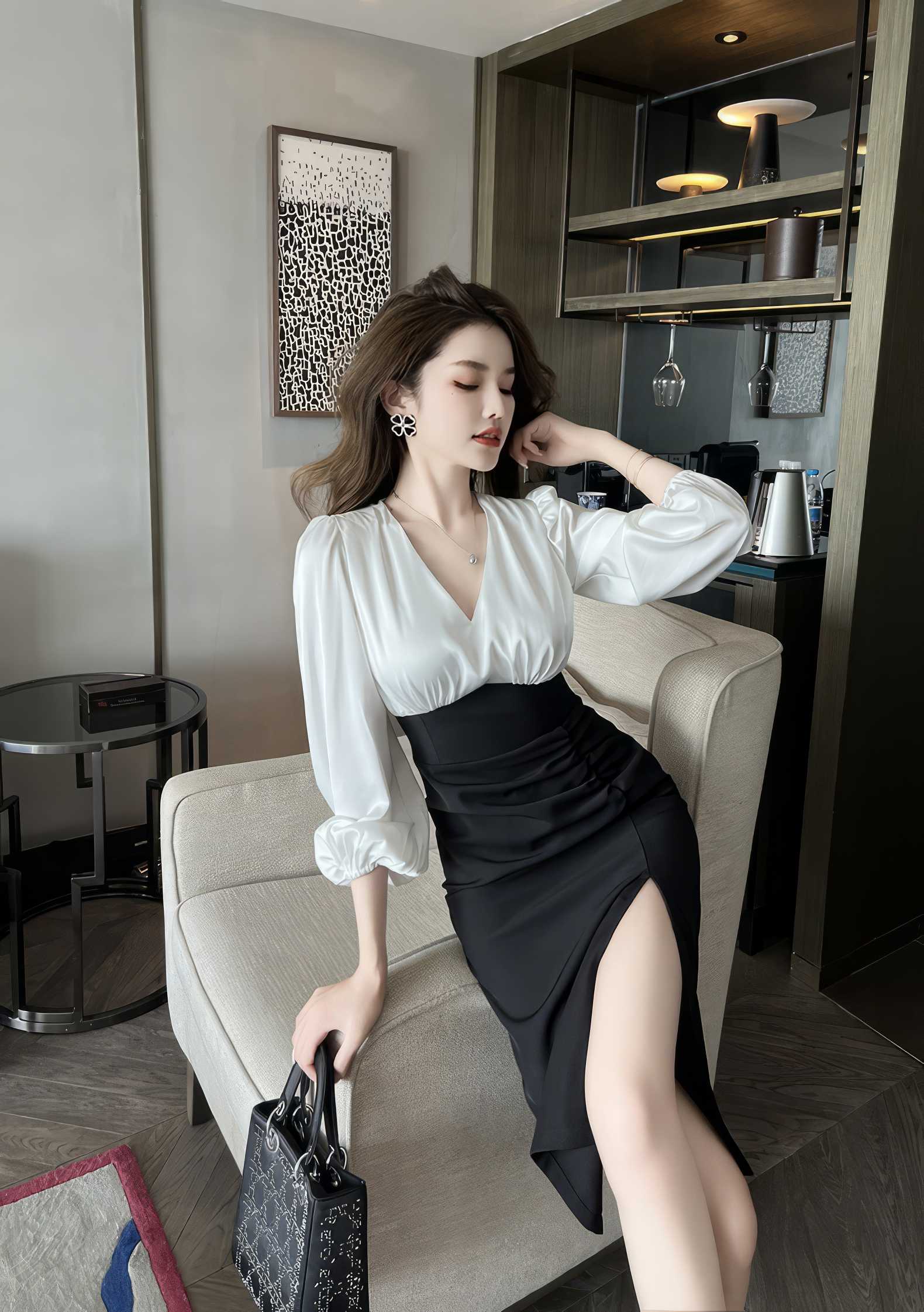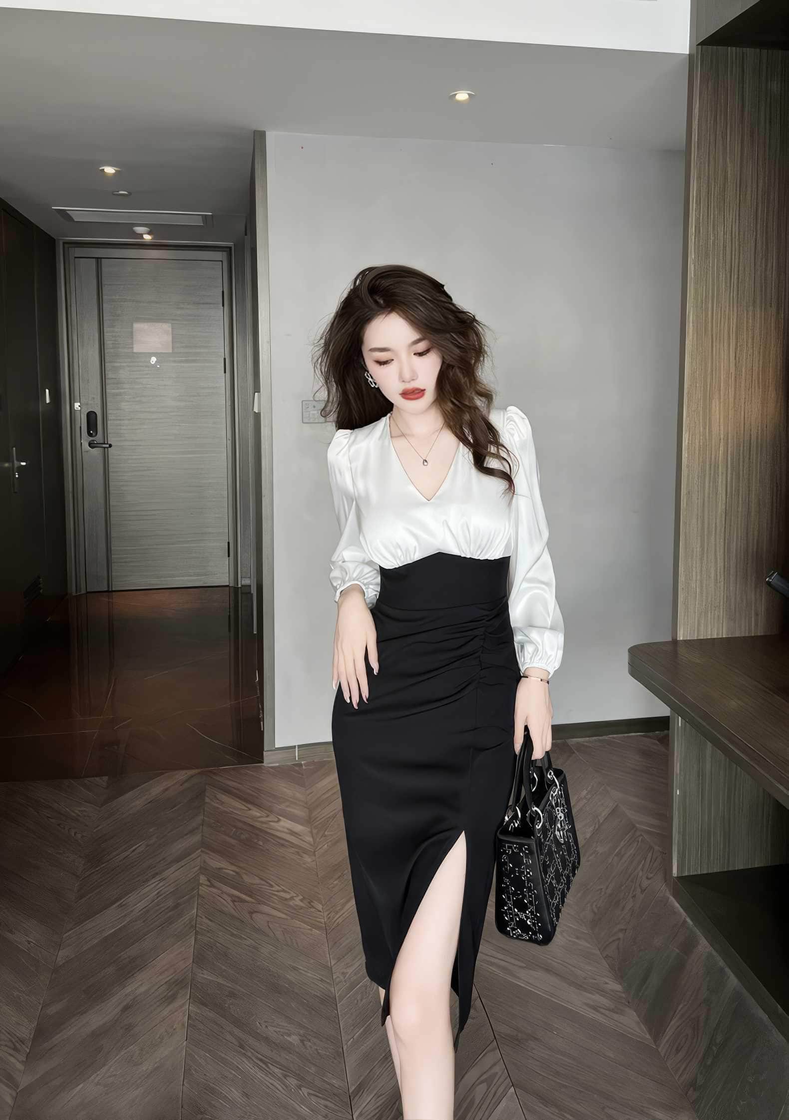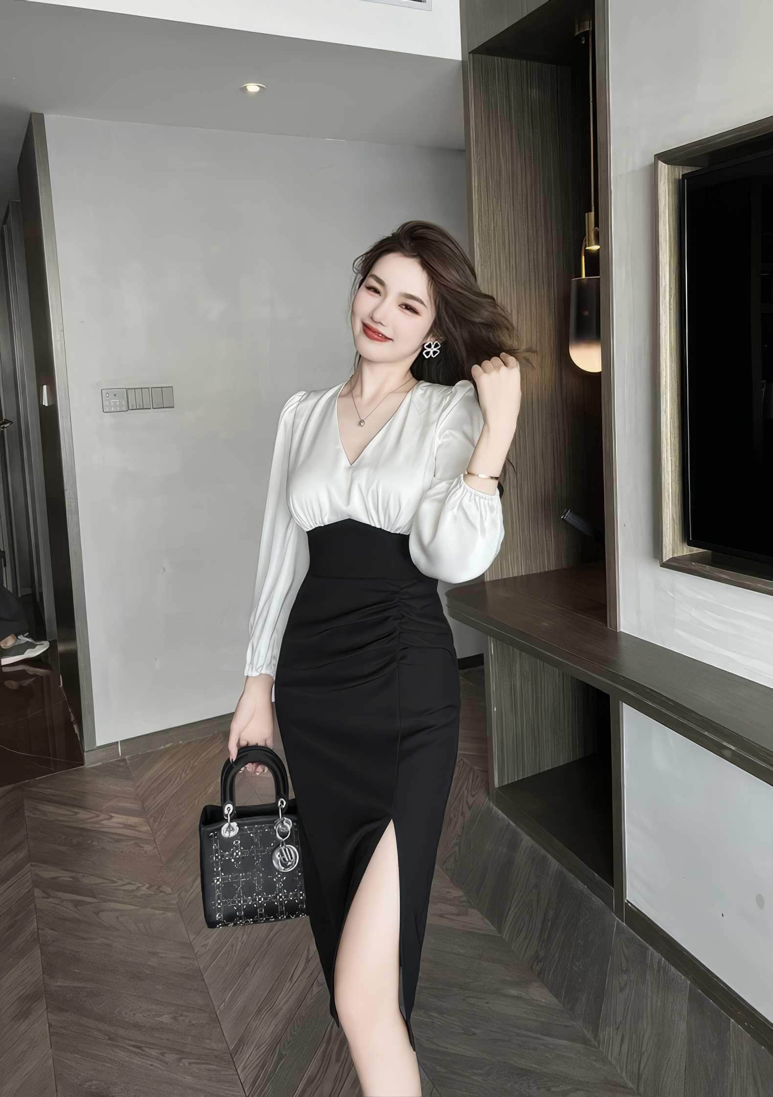 Step into the limelight with confidence in this enchanting dress. The v-neckline adds a touch of allure, while the two-toned pleated design creates a captivating visual texture that's both bold and beautiful. The long sleeves provide an elegant contrast, making it perfect for any season.