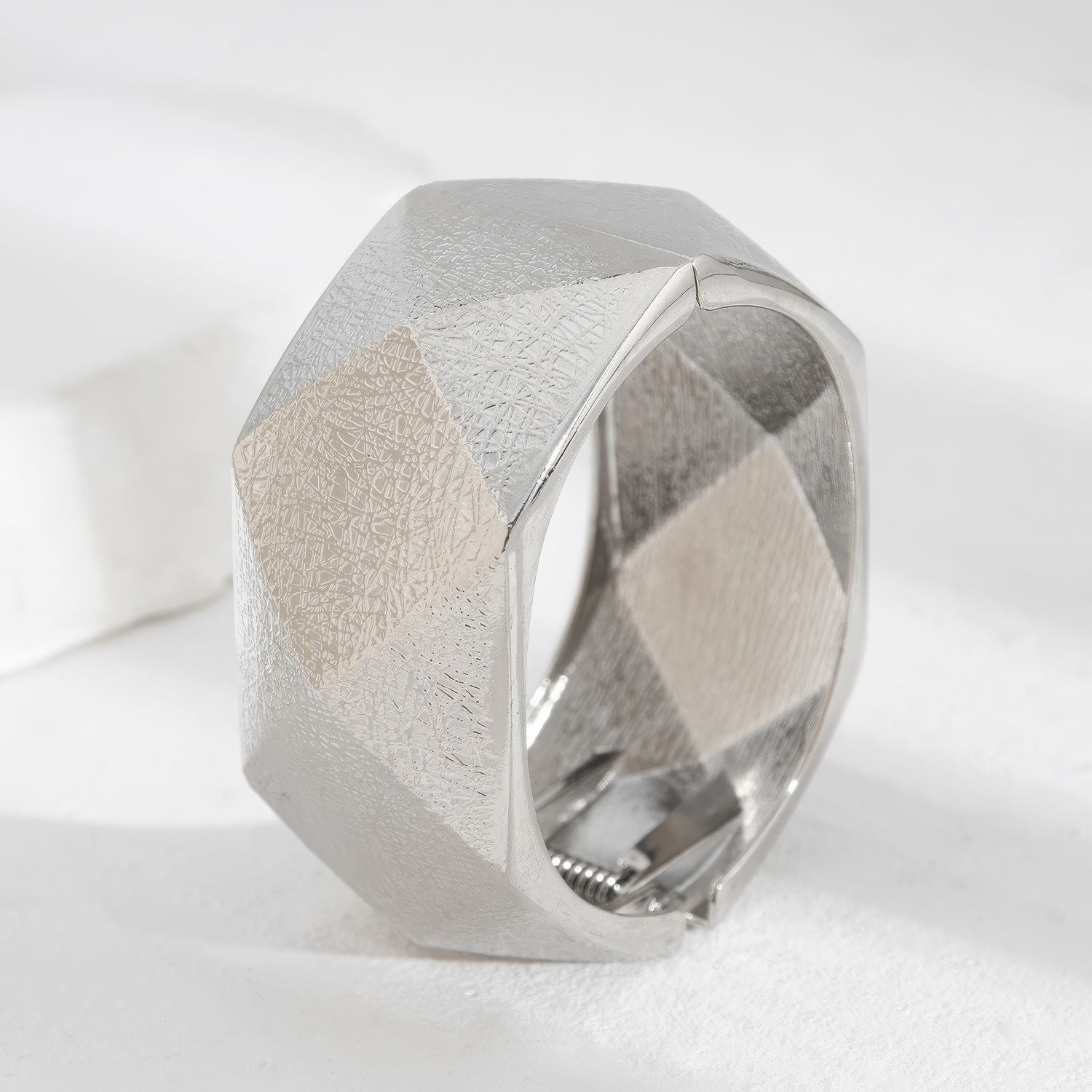 Made with a wide, contoured silhouette, these cuffs exude confidence while embracing comfort. The hinge closure ensures an effortless fit, allowing you to slip it on with ease and wear it securely throughout the day. Its polished surface catches light from every angle, creating a subtle shimmer that commands attention without overwhelming your look.