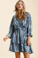 This stunning wrap dress features a captivating blue and grey tie-dye pattern that creates a modern bohemian aesthetic. Crafted from lightweight, flowing fabric, it offers comfort and movement throughout the day. The flattering surplice wrap design accentuates the neckline while the self-tie waist belt creates a defined silhouette. Long sleeves with gathered elastic cuffs add sophistication, while the playful tiered ruffle hem brings feminine charm. Perfect for casual outings, brunch dates, or vacation wear, this versatile mini dress transitions effortlessly from day to evening with the right accessories.
